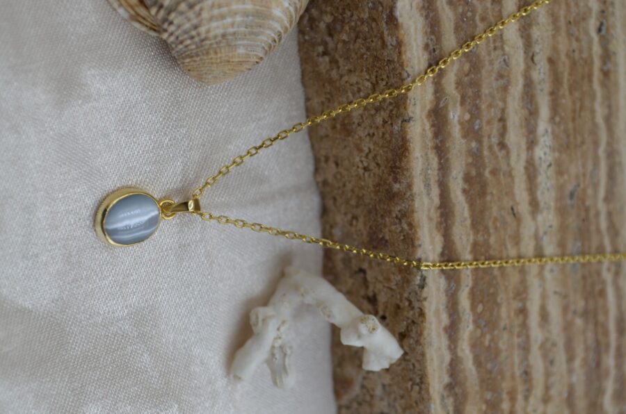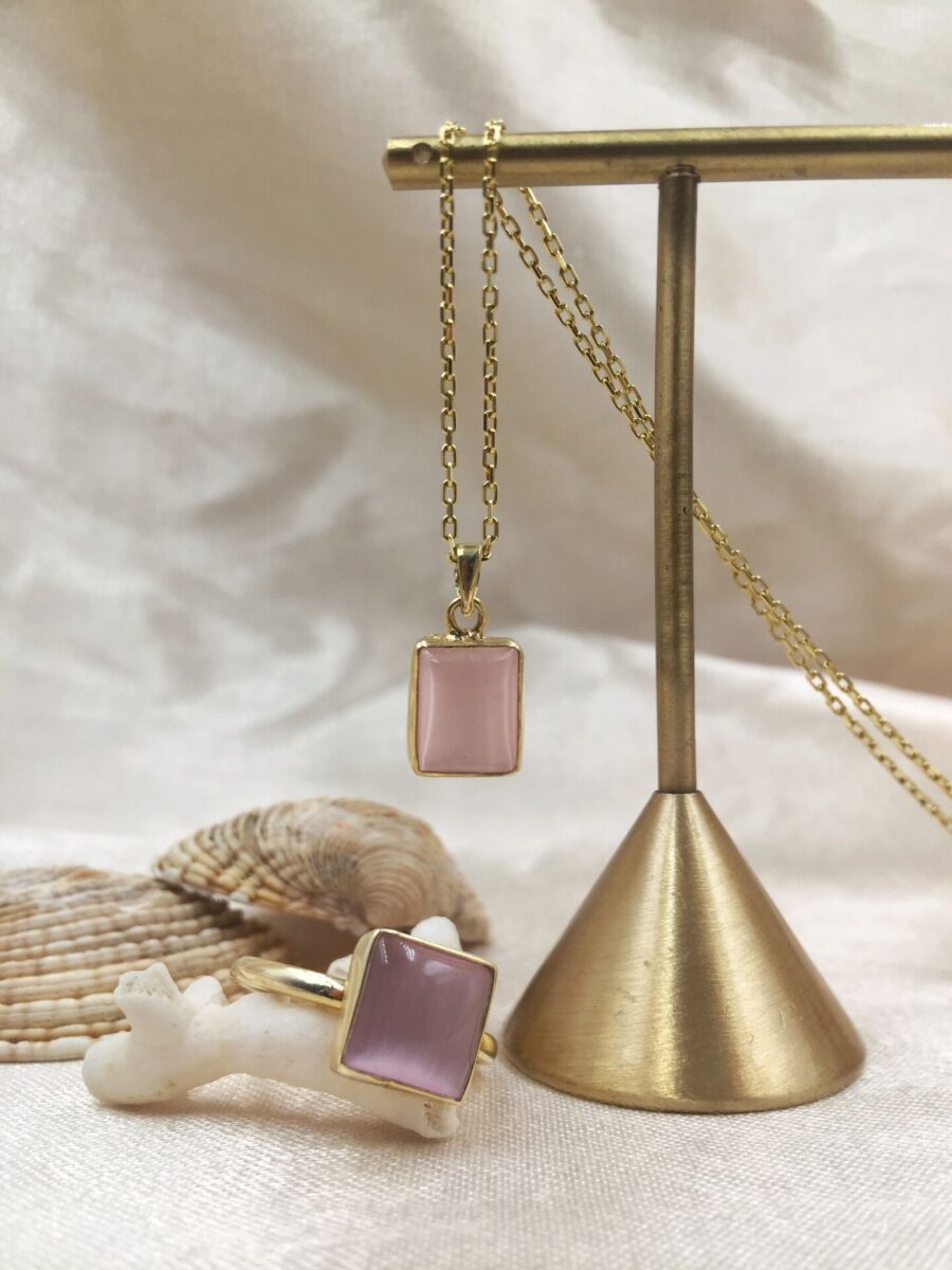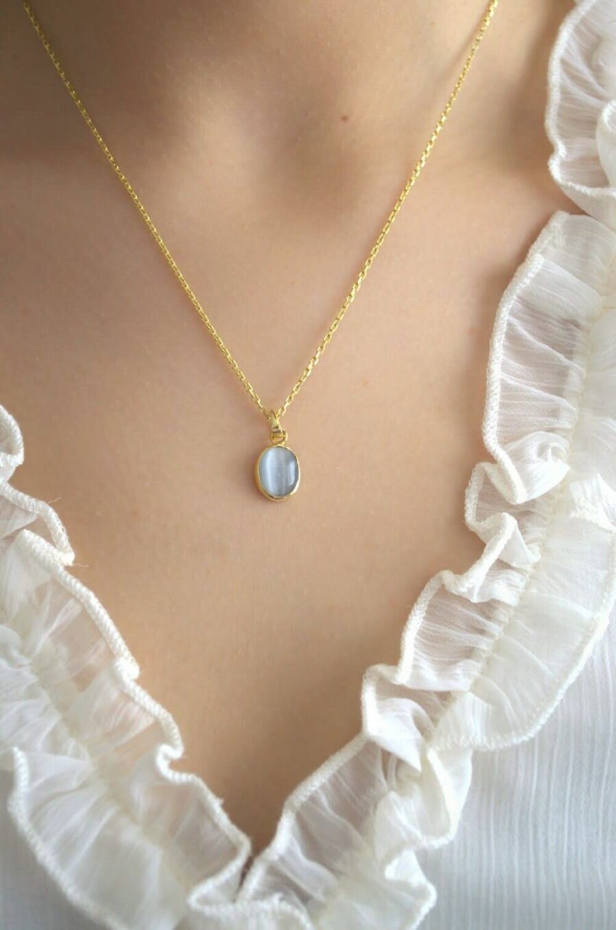 Gerçek Oval Gri Kedi Gözü Kolye | Altın Kaplama 925 ® Gümüş