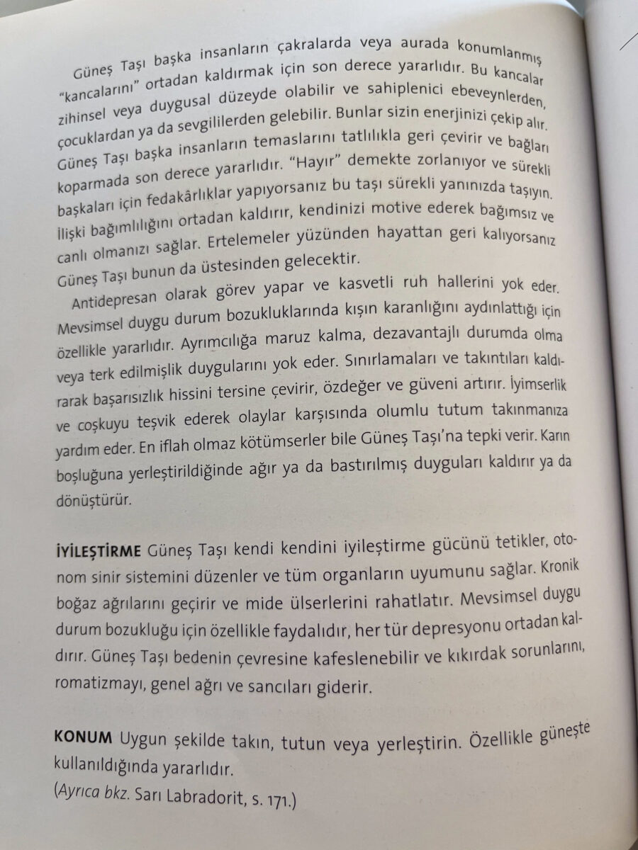 taşıyan kişiye şans getirir,dişil enerjiyi yükseltir ve cinsel isteksizlik yaşayanlar üzerinde etkisi yüksektir.Bereket enerjinizi çoğaltır ve özsevginizi artırır.Diğer görsellerde güneş taşının kitabi bilgilerine ulaşabilirsiniz.